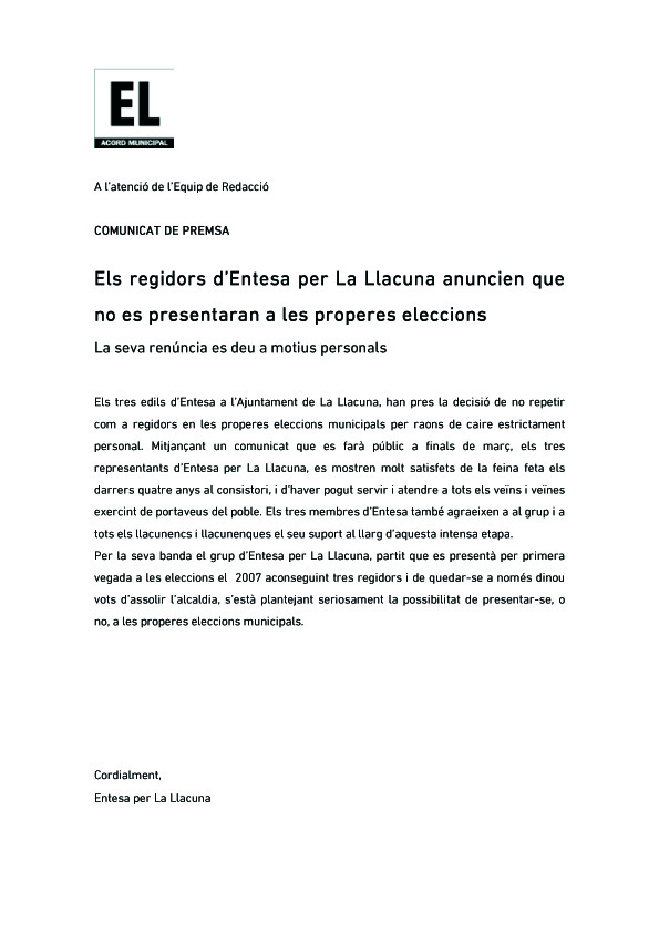 El grup municipal Entesa per la Llacuna, ha fet arribar a la Llacuna Online aquest comunicat on s’anuncia la renúncia dels tres regidors.