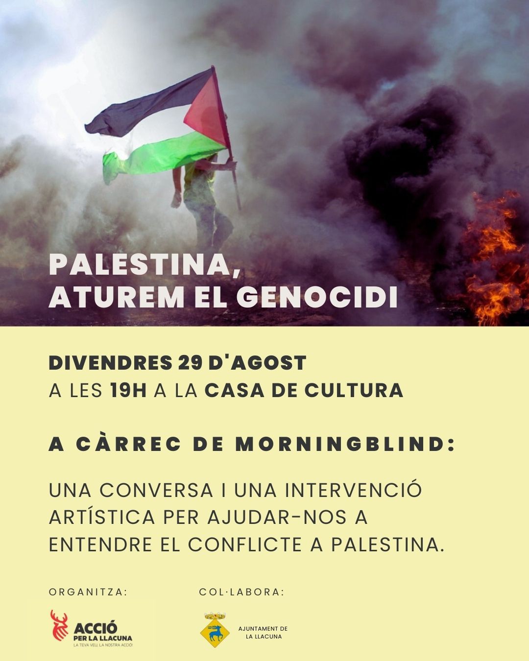 Divendres 29 d’agost, a les 7 de la tarda, al Centre de Cultura (carrer Major, 4) de la Llacuna una xerrada: “Palestina, aturem el genocidi” i una intervenció artística de Morningblind, per ajudar-nos a entendre el conflicte a Palestina.